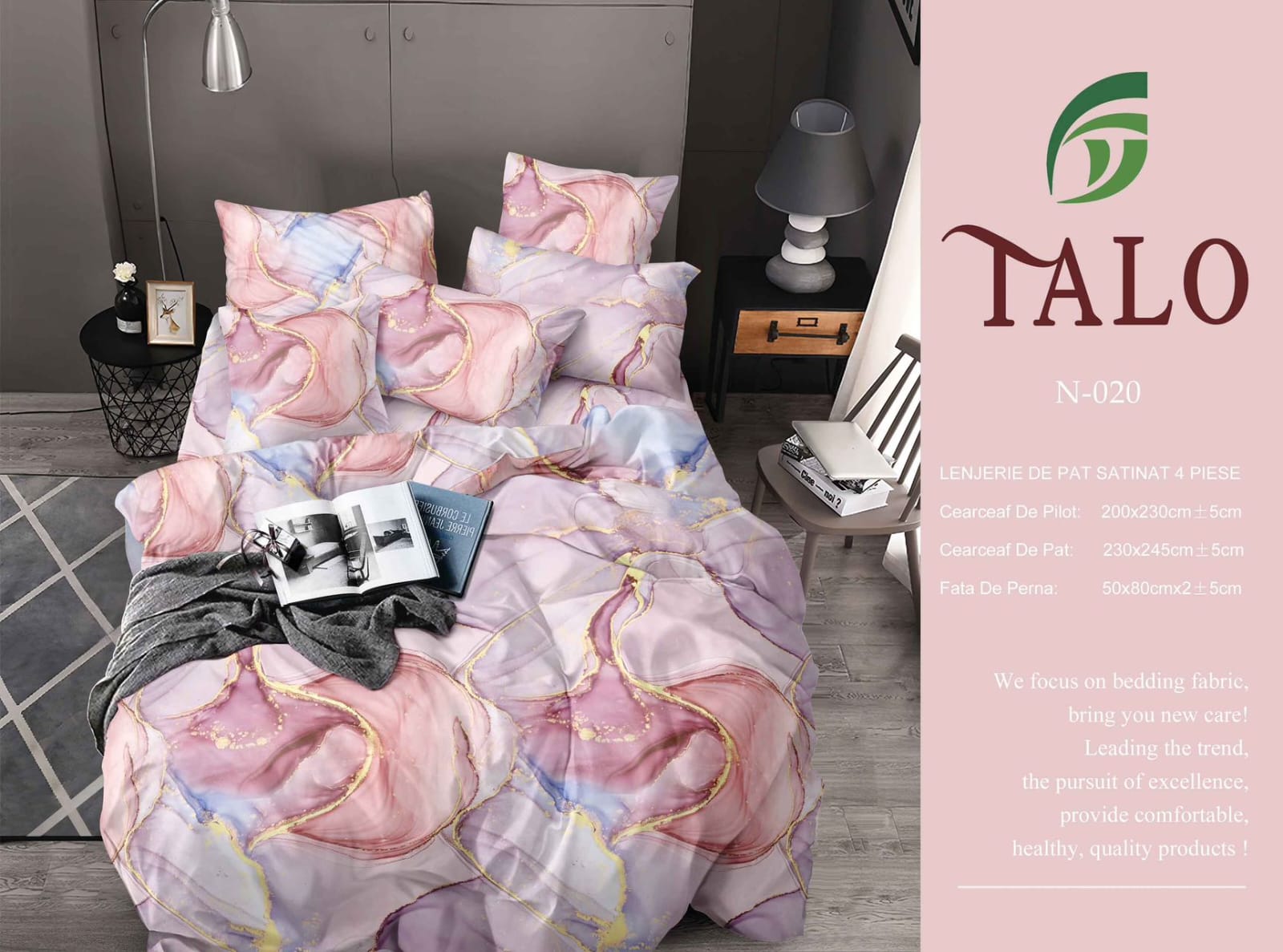 Design artistic, inspirat din textura marmurei, în nuanțe de roz pastel cu detalii aurii. O alegere ideală pentru un dormitor luminos și romantic.