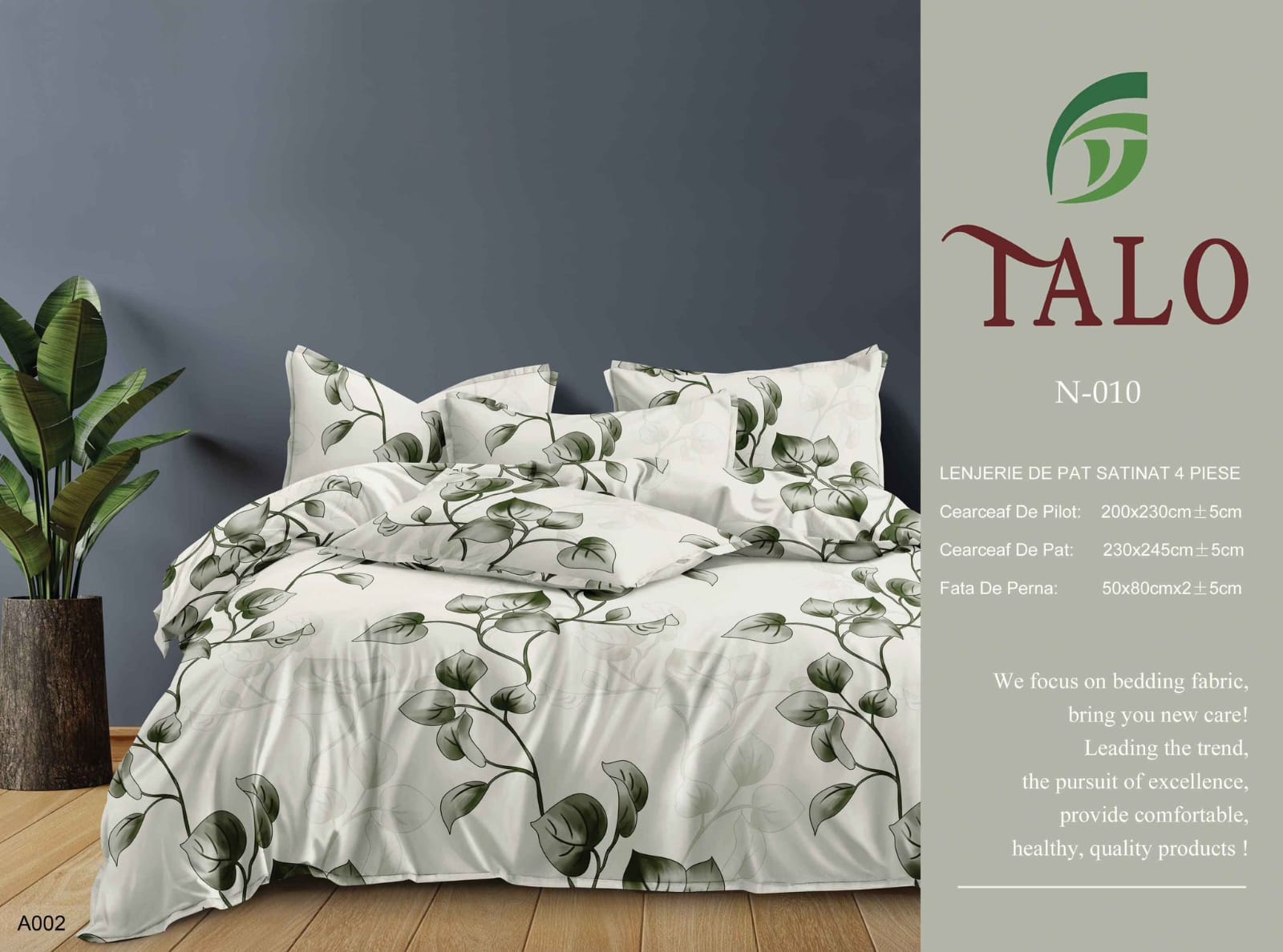 Inspirată de natură, această lenjerie cu imprimeu elegant de frunze verzi creează o atmosferă relaxantă și proaspătă în dormitor. Materialul satinat fin îți oferă confort maxim, iar designul modern adaugă un plus de stil spațiului tău de odihnă.